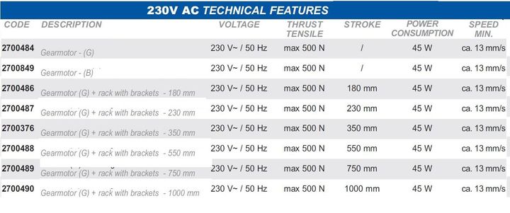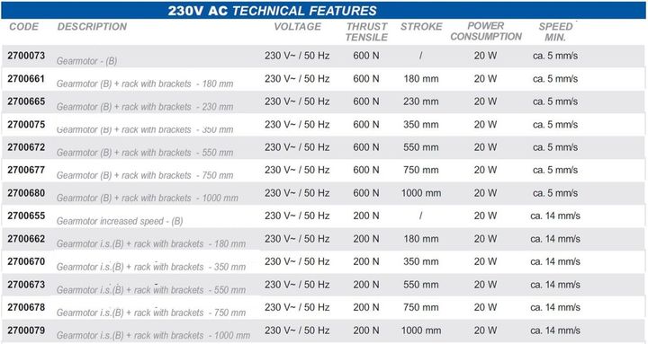 Tandheugel S2, motor voor dakramen, koepels, kantelramen en zonwering. Tandemwerking. Slag tot 1000 mm. 230 Vac en 24 Vdc. Onderhoudsvrij. Hoge beschermingsgraad. Beveiligingsgraad elektrische apparaten: IP 55.