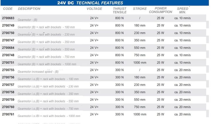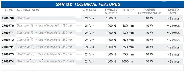 Tandheugel S1, motor voor kantelramen, koepels en zonwering. Tandemwerking. Slag 180-1000 mm. Koppel 600-800 N. 230 Vac en 24 Vdc. Hoge beschermingsgraad. Onderhoudsvrij. Beveiligingsgraad elektrische apparaten: IP 55.