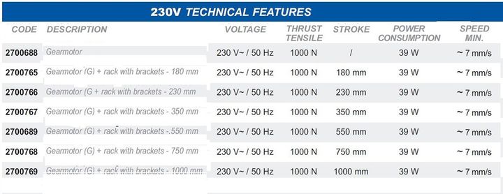 Tandheugel S0, motor voor kantelramen, koepels, luifels en zonwering. Tandemwerking. Koppel 500N. Slag tot 1000 mm. 230 Vac en 24 Vdc. Onderhoudsvrij. Hoge beschermingsgraad. Beveiligingsgraad elektrische apparaten: IP 55. Heeft een elektronische eindschakelaar voor het openen en sluiten en een beveiliging tegen overbelasting.